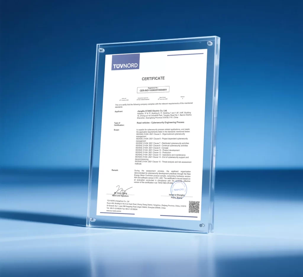 With regulations such as the UNECE WP.29 R155 making cybersecurity management systems mandatory for vehicle manufacturers, the ISO/SAE 21434 standard provides a widely recognized framework for compliance. Obtaining this certification demonstrates GTAKE Electric’s proactive steps to meet global market access requirements and fulfill its responsibility for supply chain security.