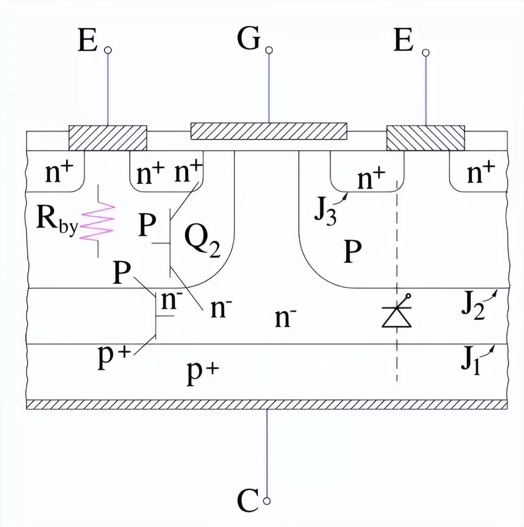 The approximate equivalent circuit of the IGBT consists of a MOS tube and a PNP transistor (Q1 ). Considering the resistance provided by the n- drift region, the resistor Rd is already included in the circuit, and this equivalent circuit can be derived by scrutinizing the basic structure of the IGBT, which is shown in the figure below.
